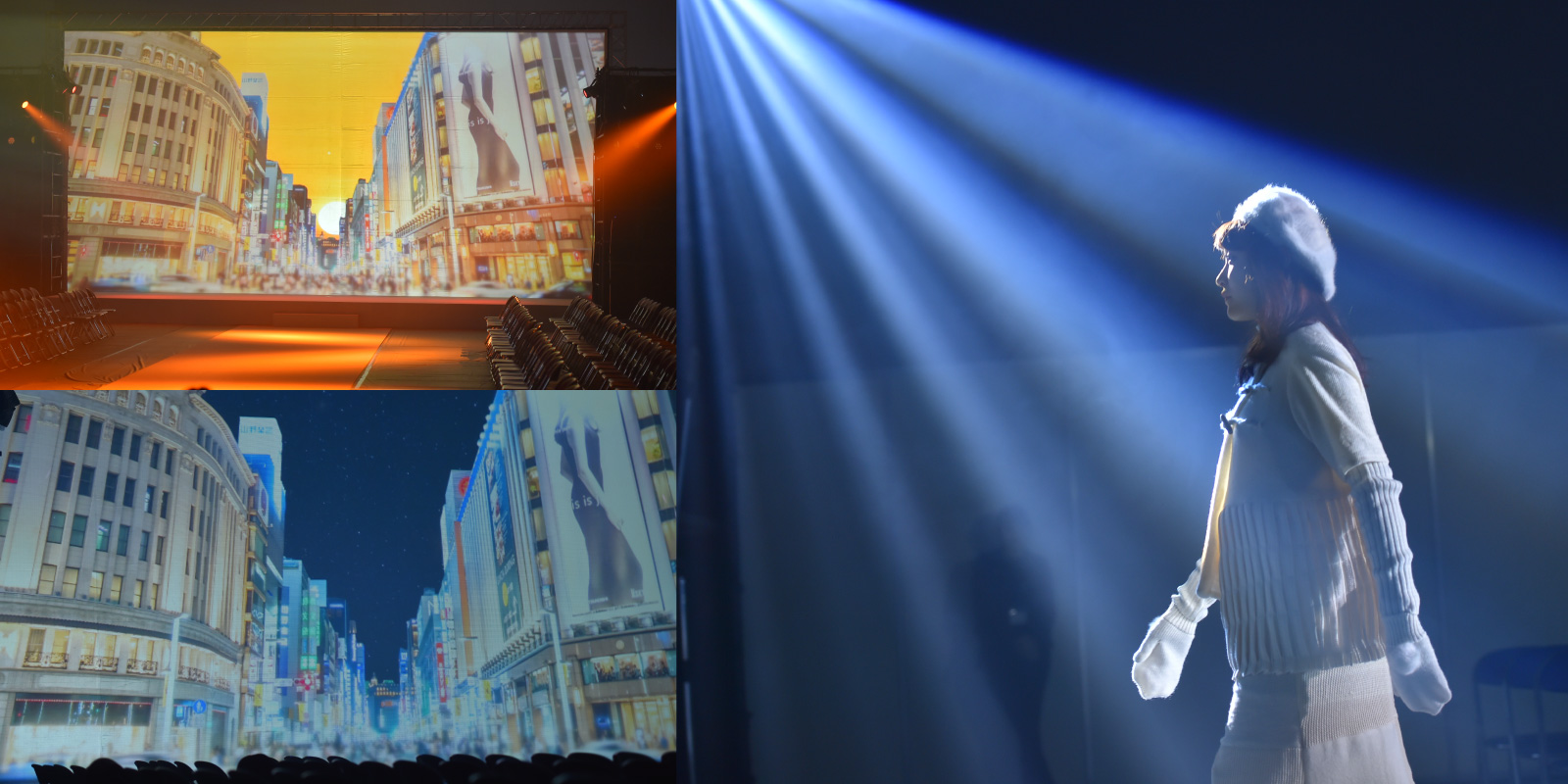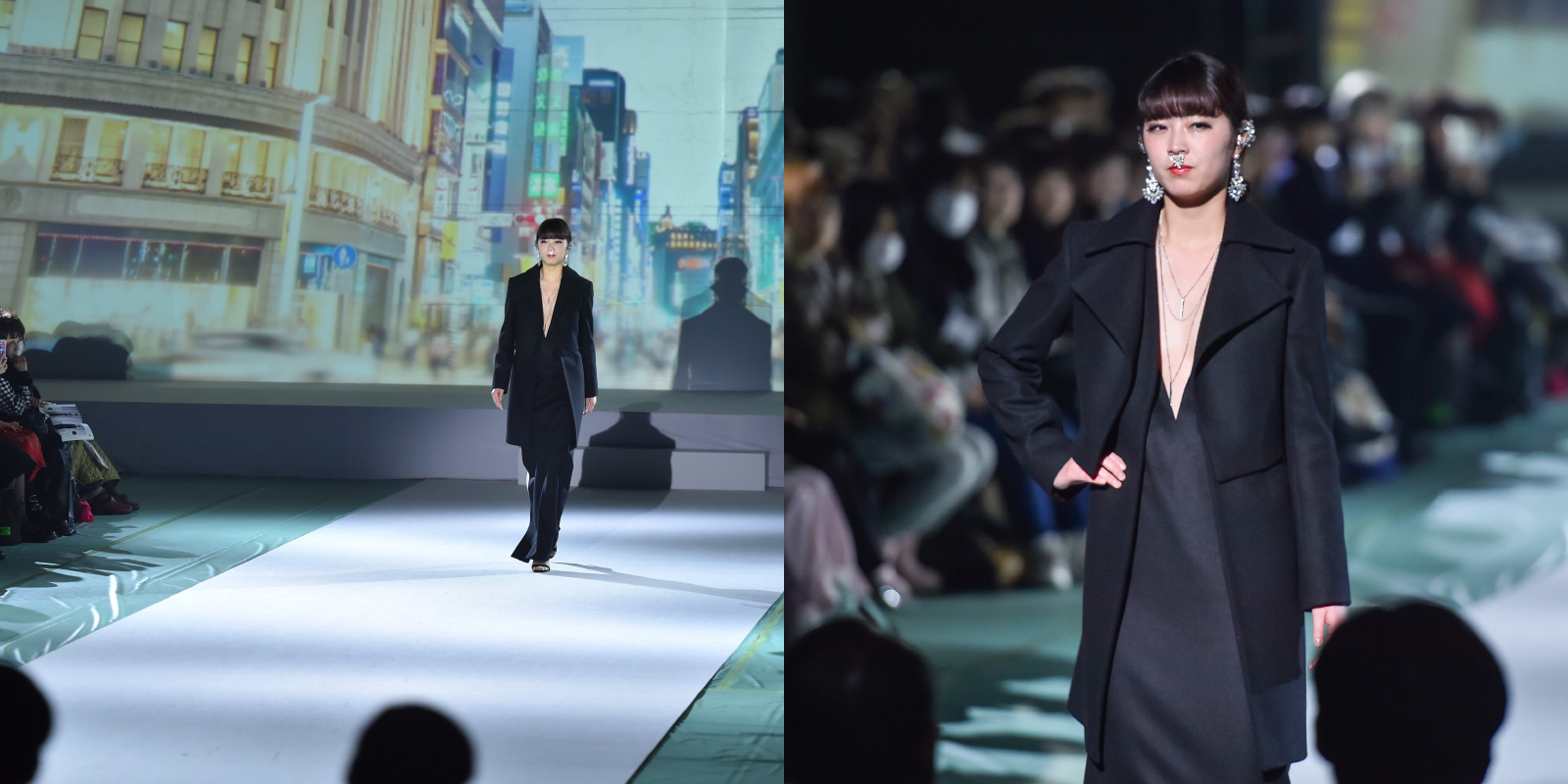 銀座を背景に、5つのシーンを設けてショーを披露。夕暮れ→夜→雨→雪→夜明けというように移り変わる銀座の風景で自分の才能や将来への不安が徐々に明けていき、最後にはランウェイに光が差す演出を入れることで、未来への希望を表現します。