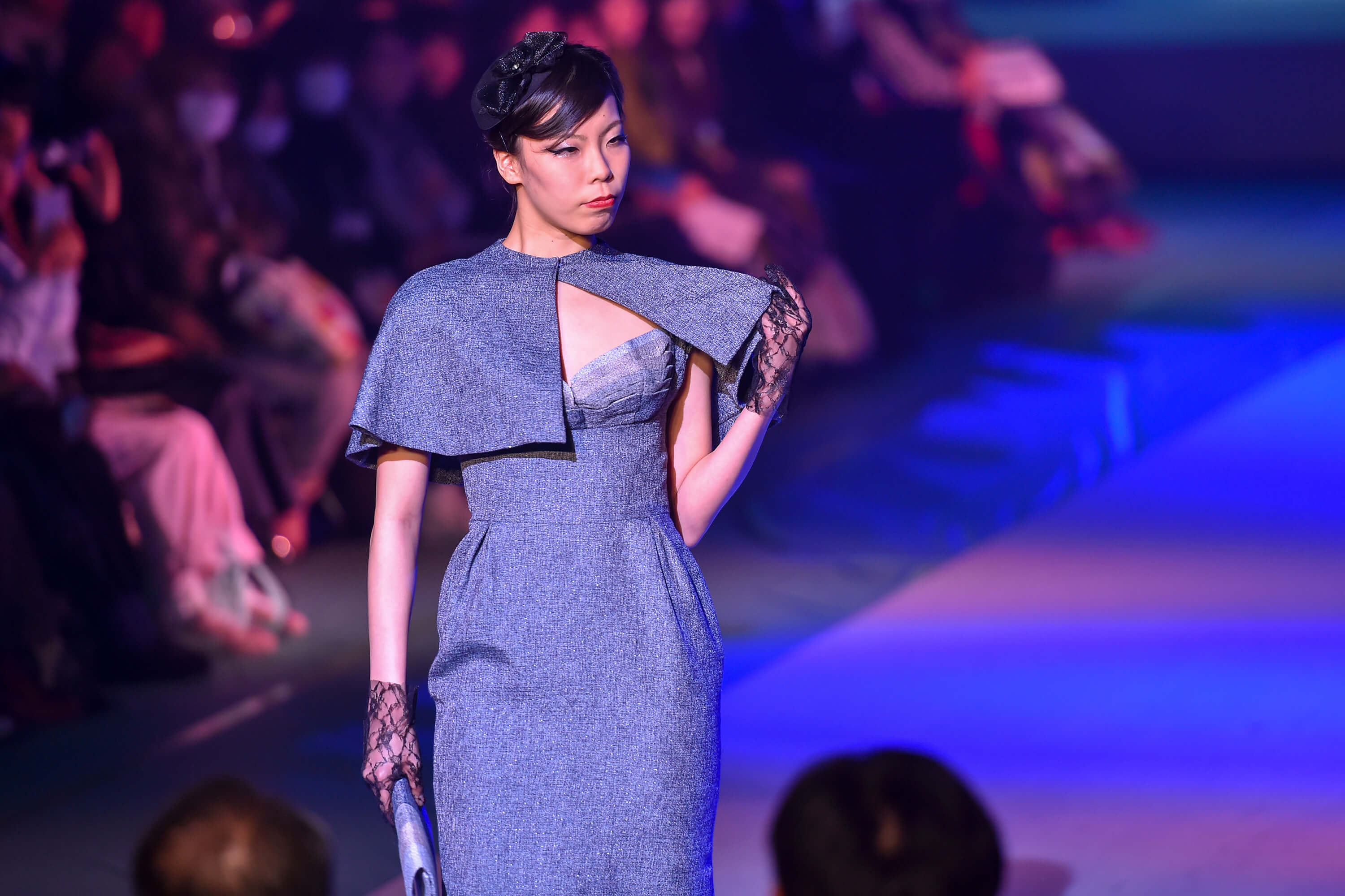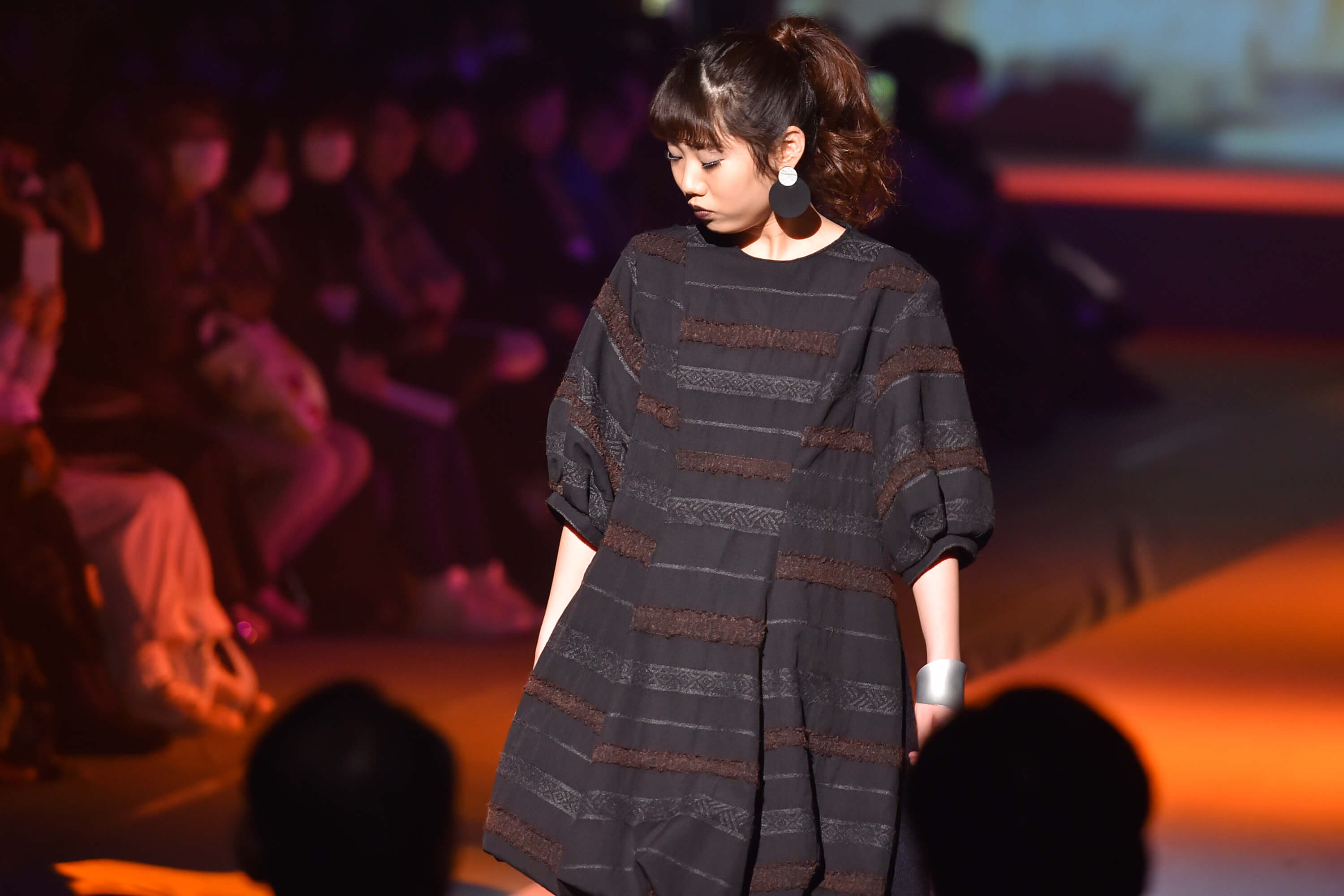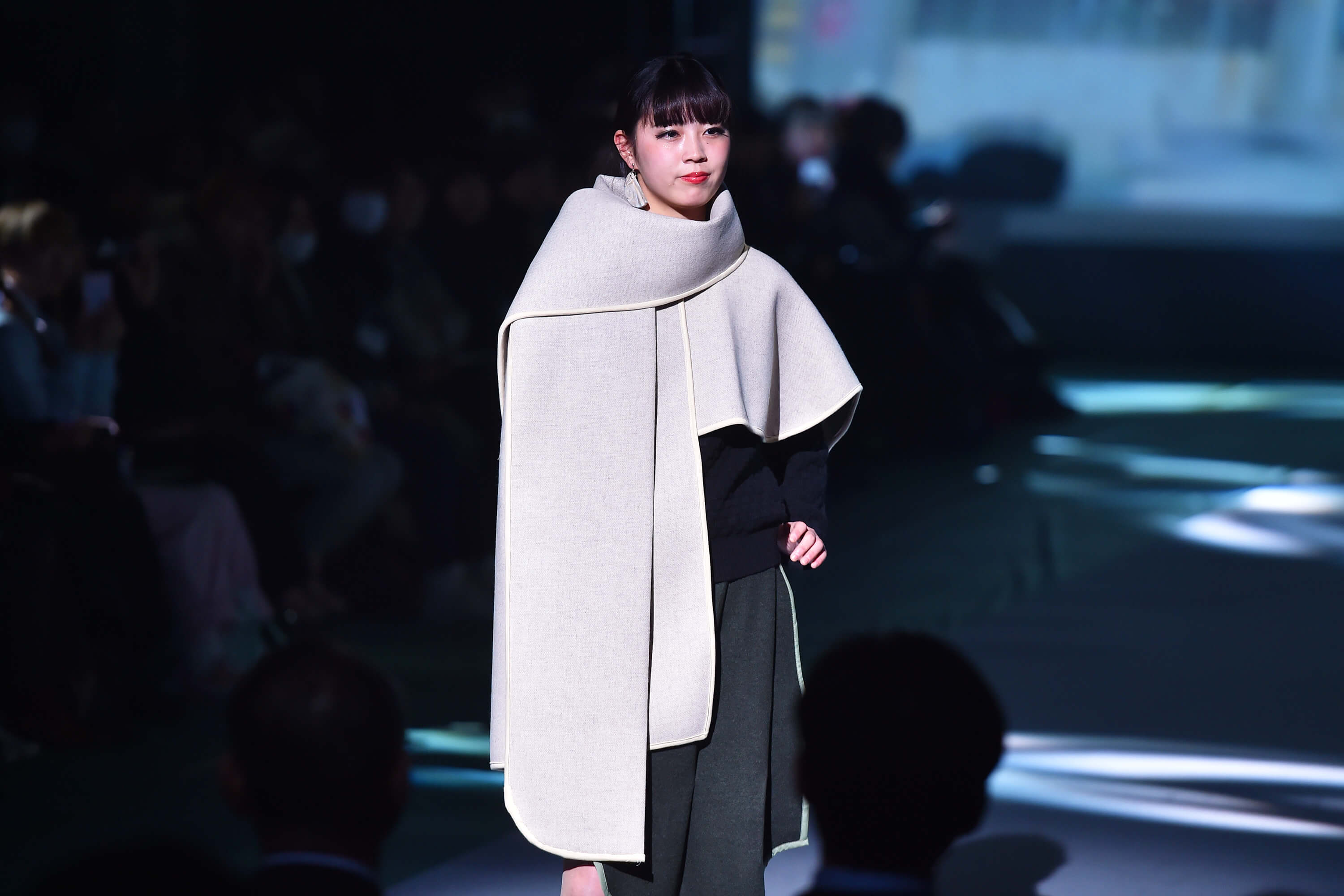 ショーの最初を飾ったのは、女性自身の強さの部分をテーマに、尾州の生地をふんだんに使用して、美しいフレアやプリーツを施したケープが主役の作品。そのほか、バルーンスカートワンピースやジャケットなど、クールな印象の衣装が登場しました。