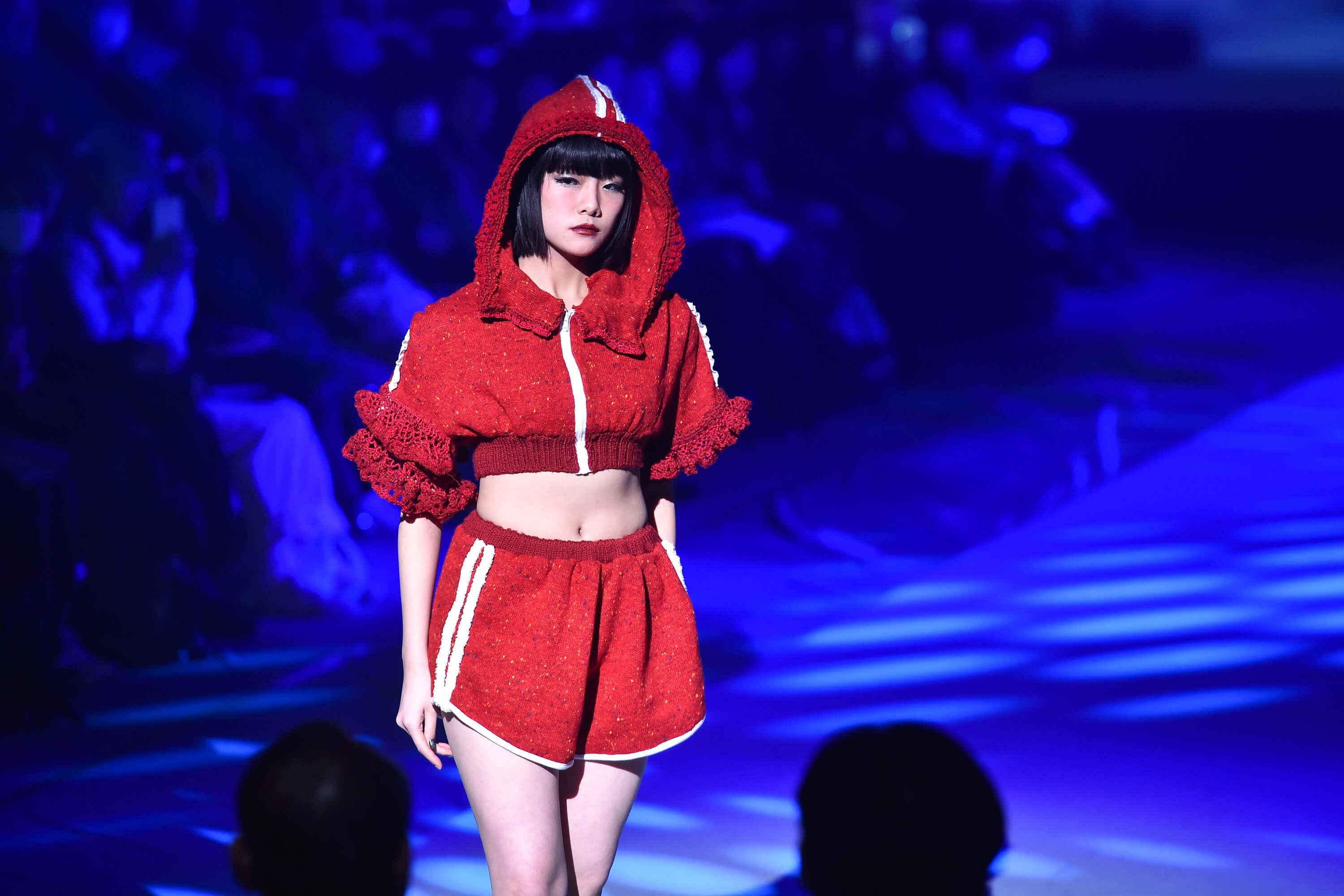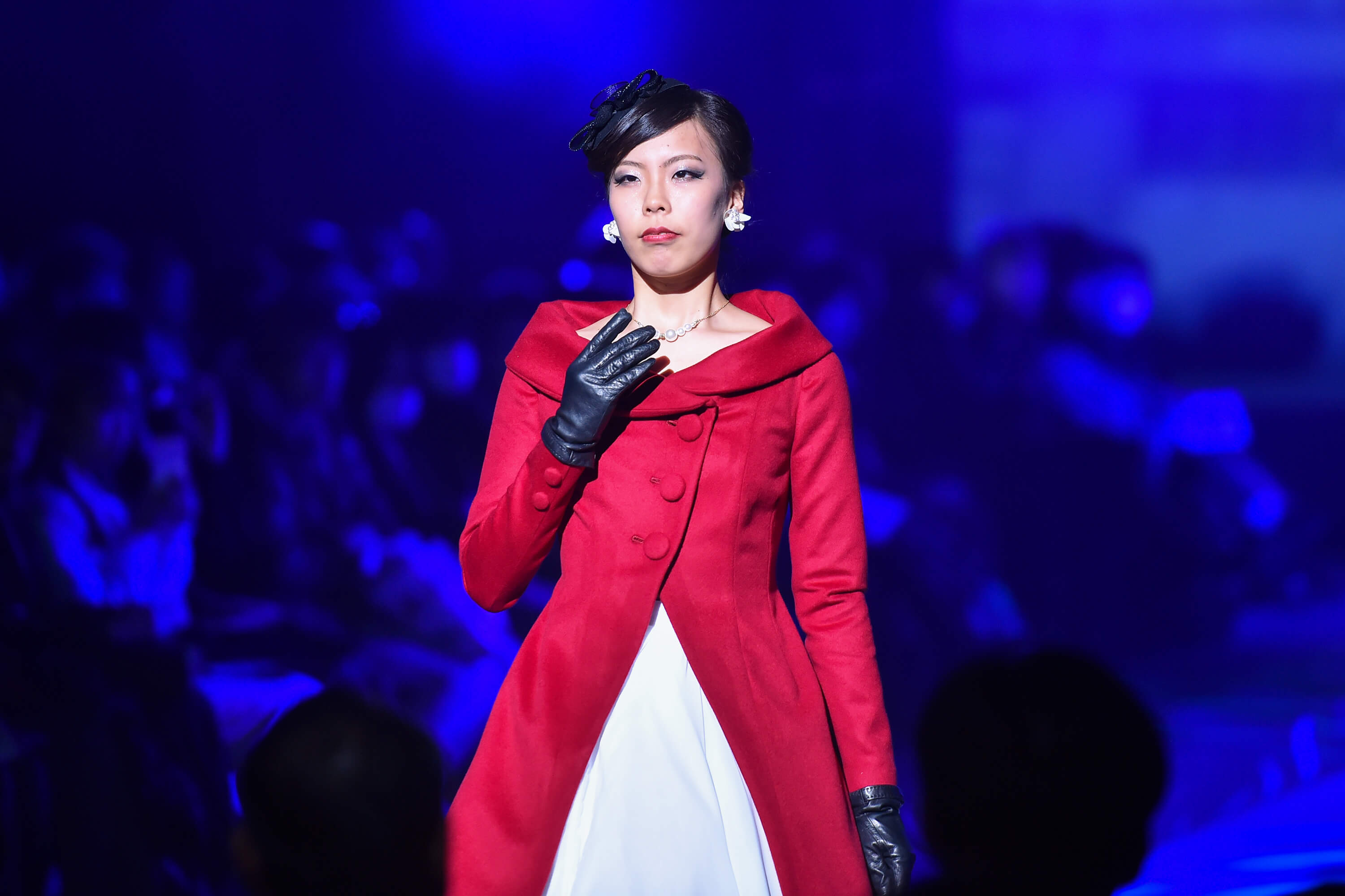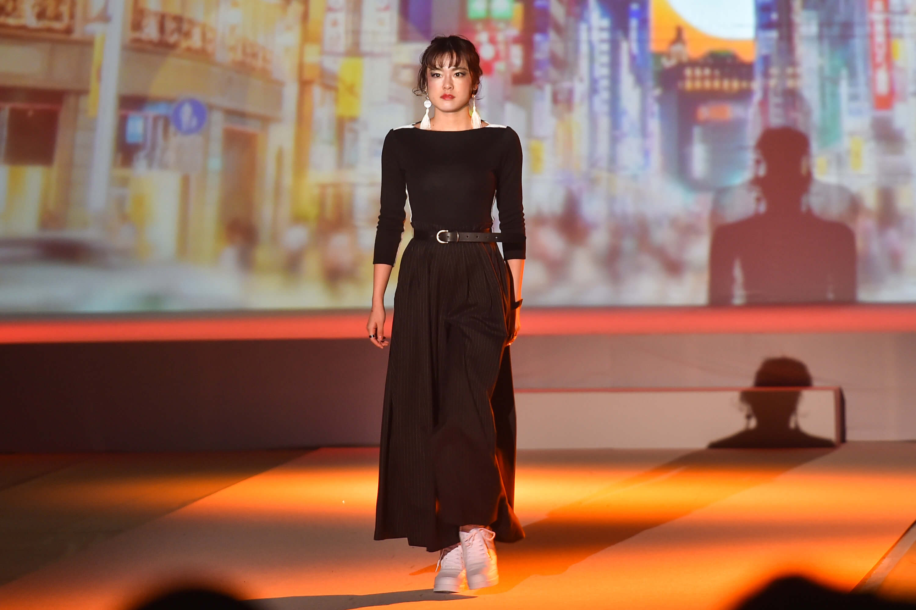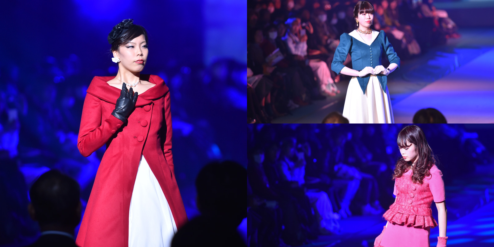 ショーの最初を飾ったのは、女性自身の強さの部分をテーマに、尾州の生地をふんだんに使用して、美しいフレアやプリーツを施したケープが主役の作品。そのほか、バルーンスカートワンピースやジャケットなど、クールな印象の衣装が登場しました。