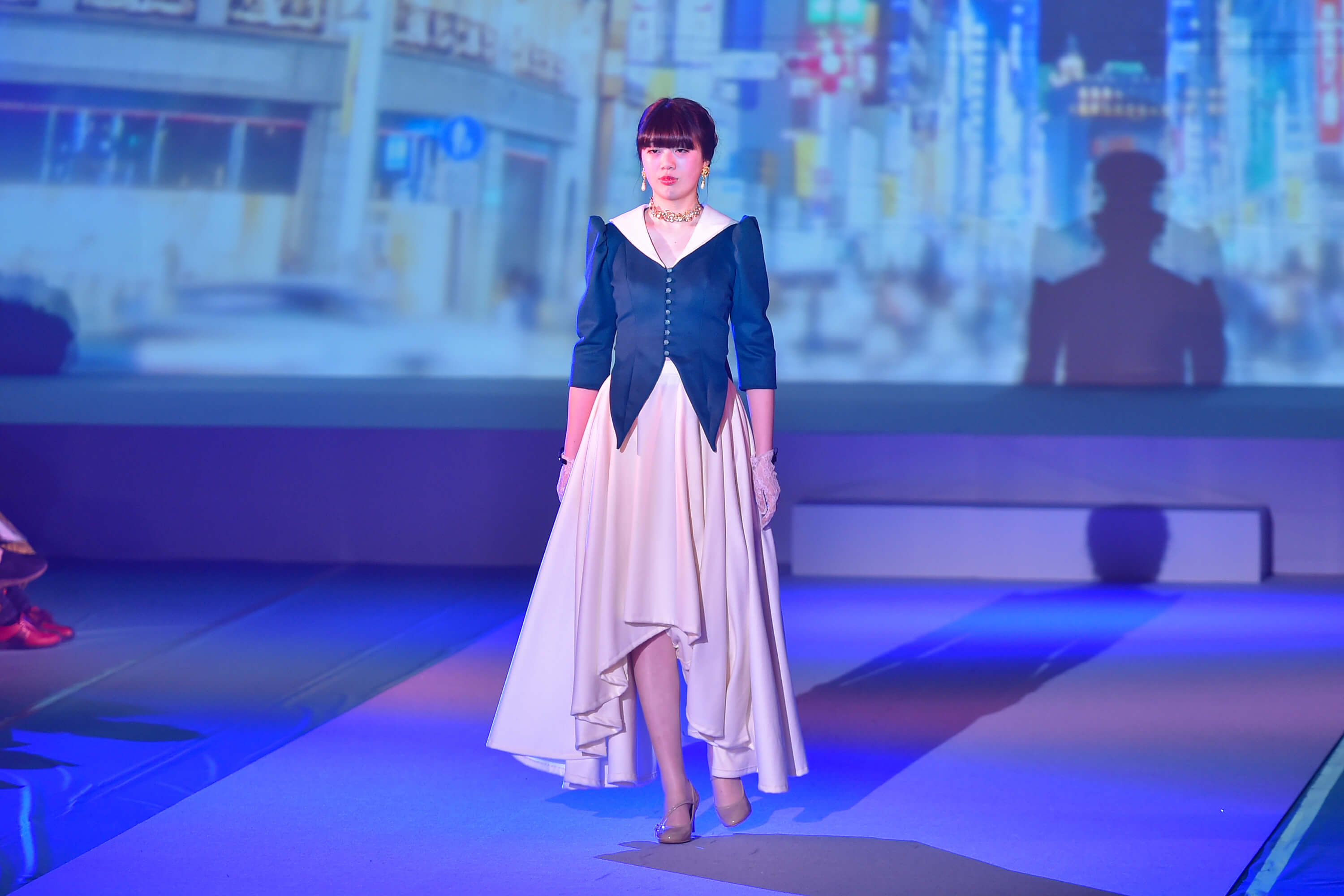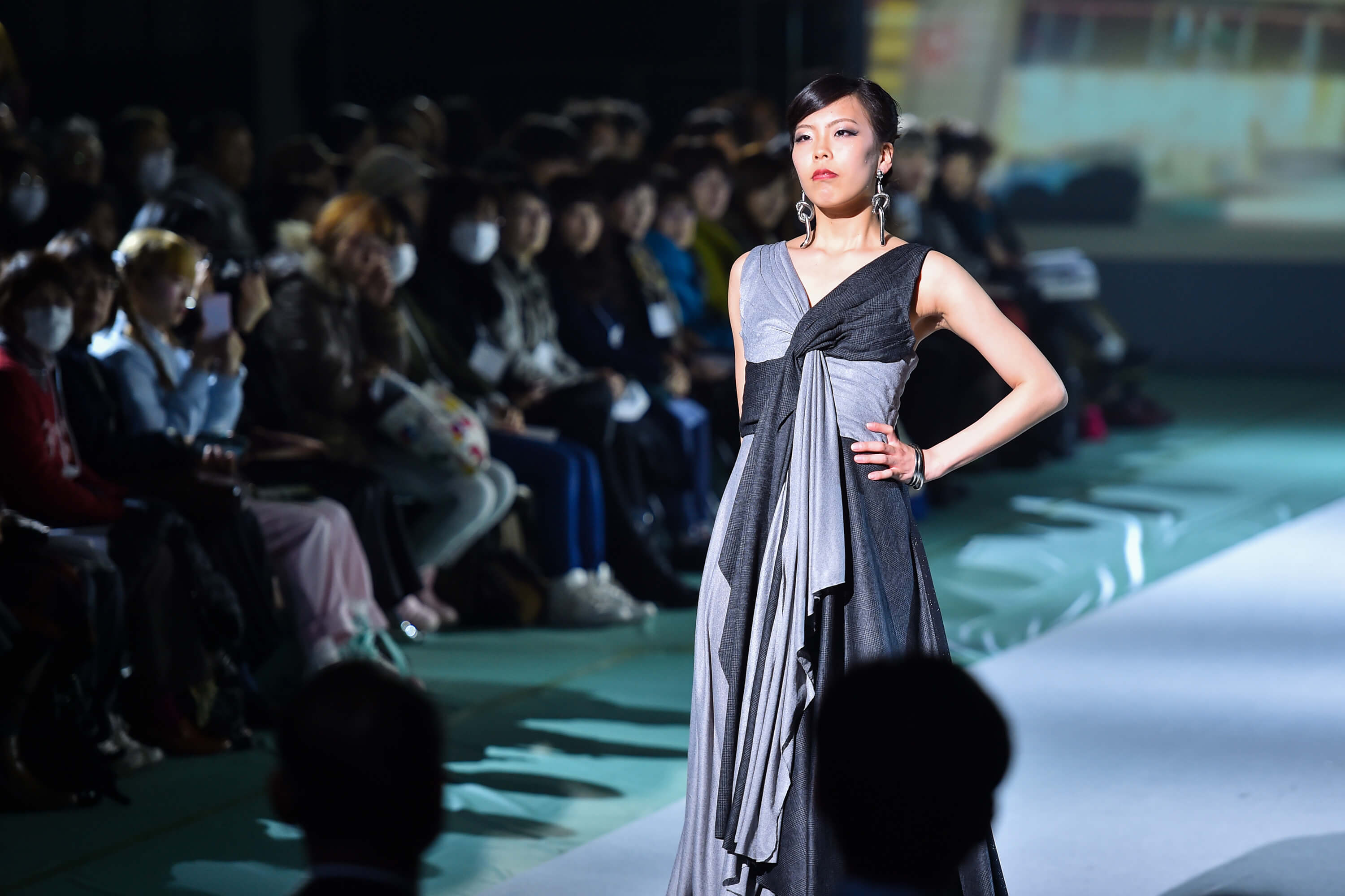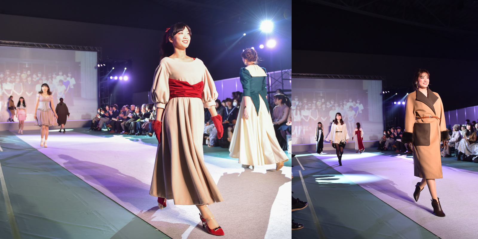 一宮市を訪れ、自分のイメージに合う生地を探すところから始まった作品制作。集大成となるファッションショーでは、約500人の観客の前で衣装を披露しました。デザインから縫製を手掛けたのはもちろん、当日はモデルもヘアメイクも学生たちが務め上げました。