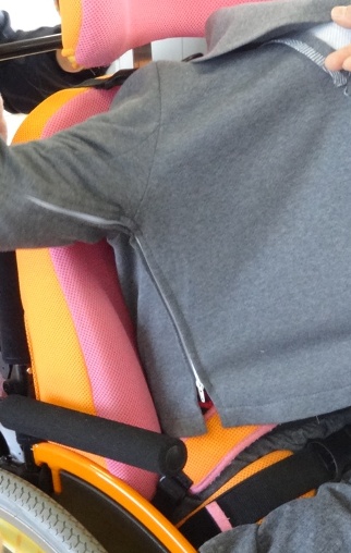 学校の生徒の希望から開発内容を決定し、身体の動きに合わせた衣服のデザインや素材の検討を行いました。さらに、モデルを引き受けてくれた生徒の要望を聞きながら、着やすい・着せやすい工夫や、座った状態でもシルエットが美しくなるパターンを模索して、「おしゃれ」で、かつ「着やすい、着せやすい」服を制作してきました。
